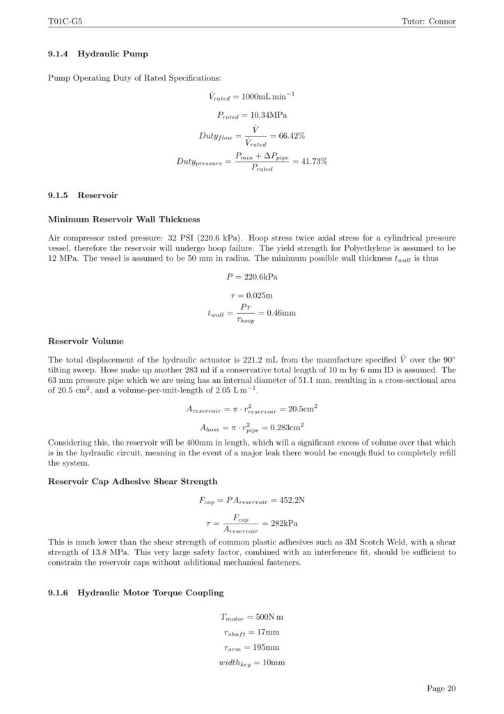 The hydraulics used a commonly available hobbyist gear pump, the CUT-YDL55, featuring a 5055 brushless motor with a rated flow rate and pressure 1000ml/min at 10 MPa (1450 PSI). An ODrive S1 ESC was used to provide smooth and precise control of the motor.