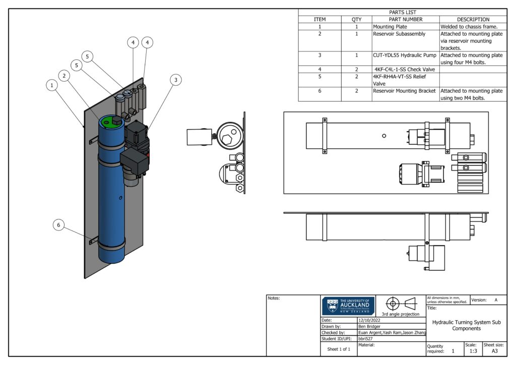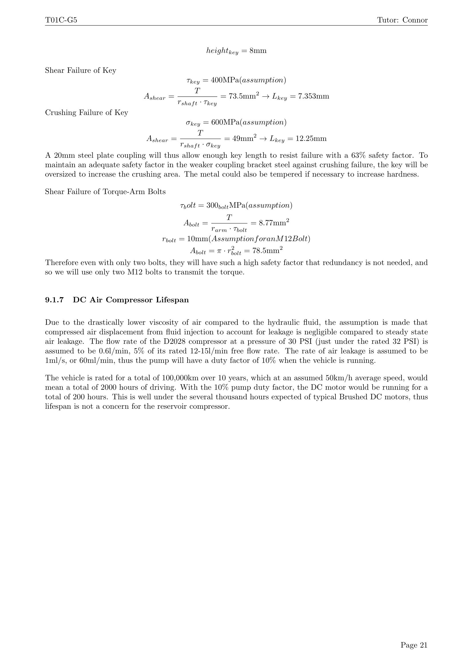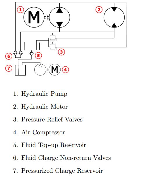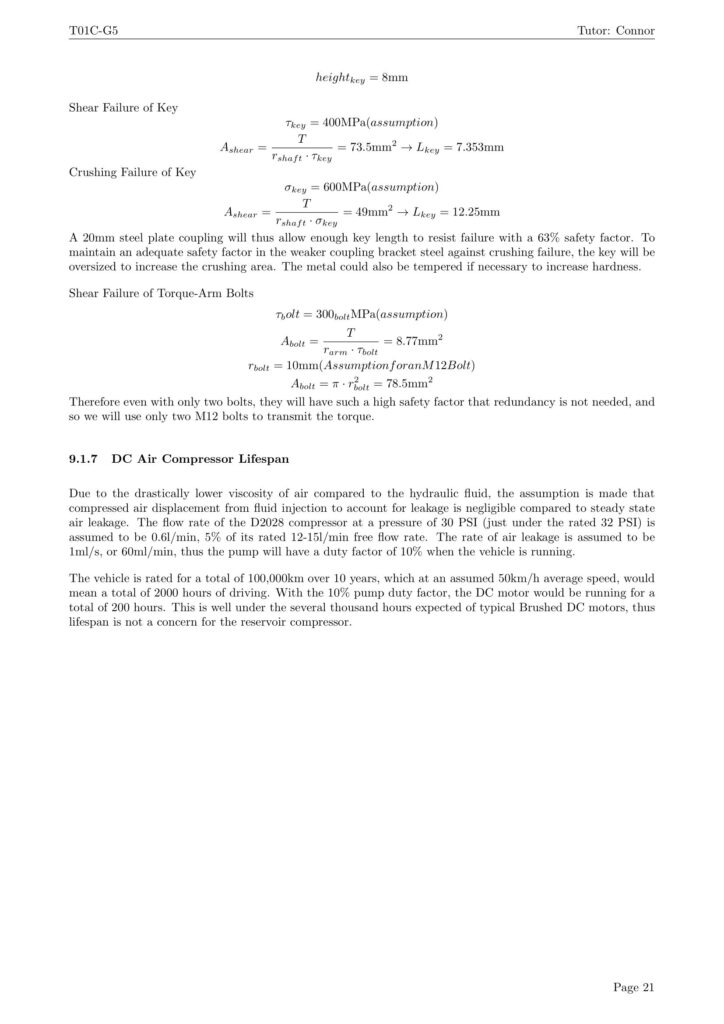Ullage pressure for the hydraulic pump was accomplished using a commonly available D2028 12V DC air compressor and a series of check valves, allowing the reservoir to be periodically repressurized to a pressure of 0.2 MPa (30 PSI). This compressor was estimated to have a run time of 200 hours in the 100,000km design life of the vehicle, well below the several thousand hours expected brush life of the DC motor.